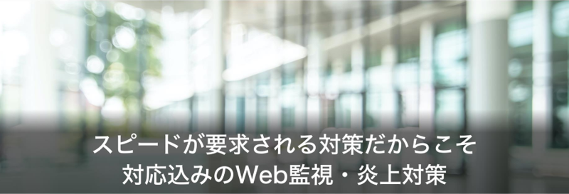 他社のWeb監視サービスでは「検索・監視→報告」までで、有事の際の対策は追加費用がかかると言われるケースがほとん どでした。その場合、対策をしてもらう必要がでてくると、追加見積もり、社内での追加承認、申込みという手続きが発生 します。しかしそんなことをしていると、どんどん対応が遅れていきます。